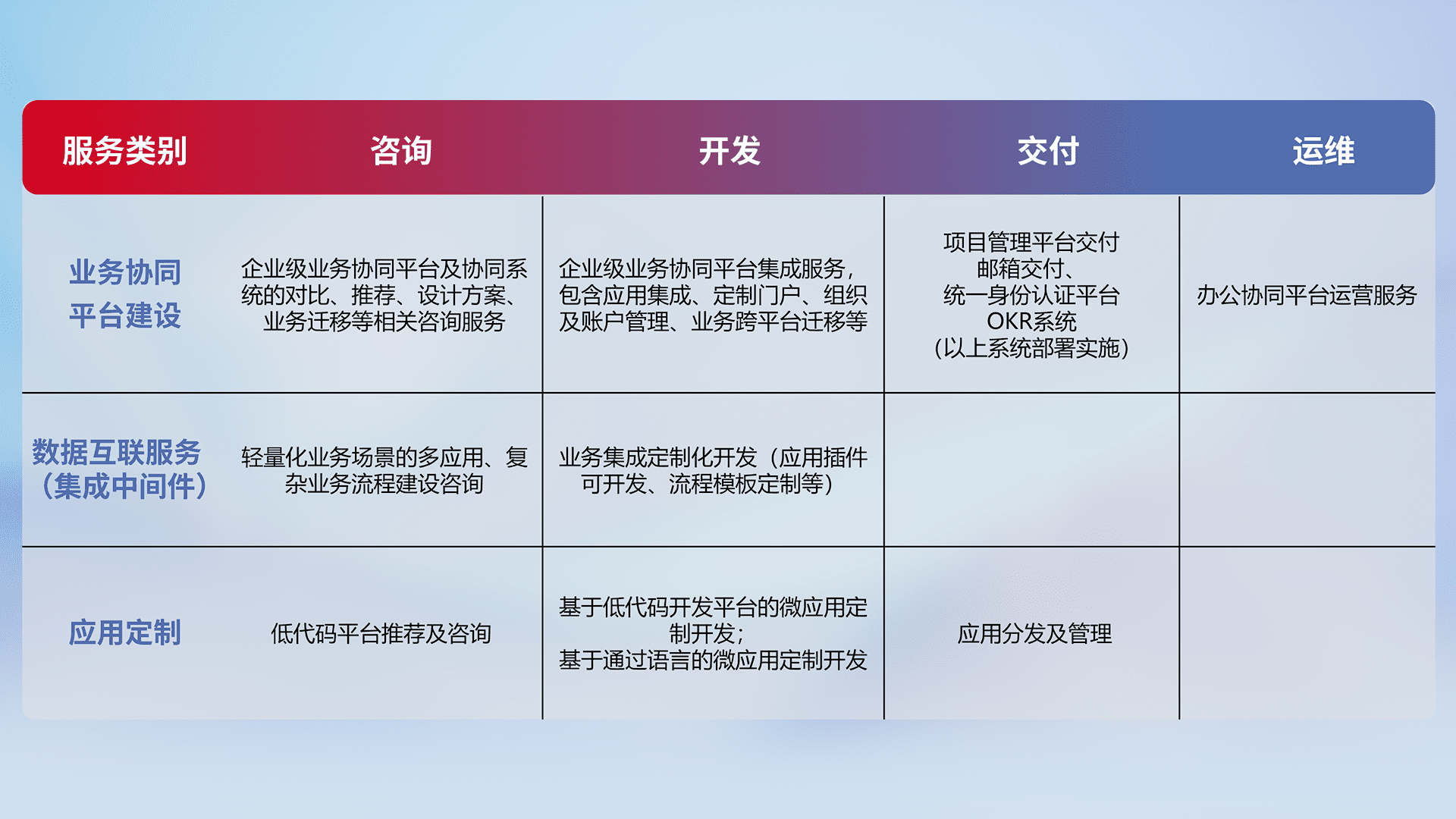 针对钉钉、、、、企微、、IDaas等平台级产品提供产品的规划、、方案、、、、交付、、、定制化开发等服务,,实现如统一协同办公、、、、智能客户服务、、、、混合会议管理、、、智能数据查询、、等业务场景,,,实现数字化转型。。