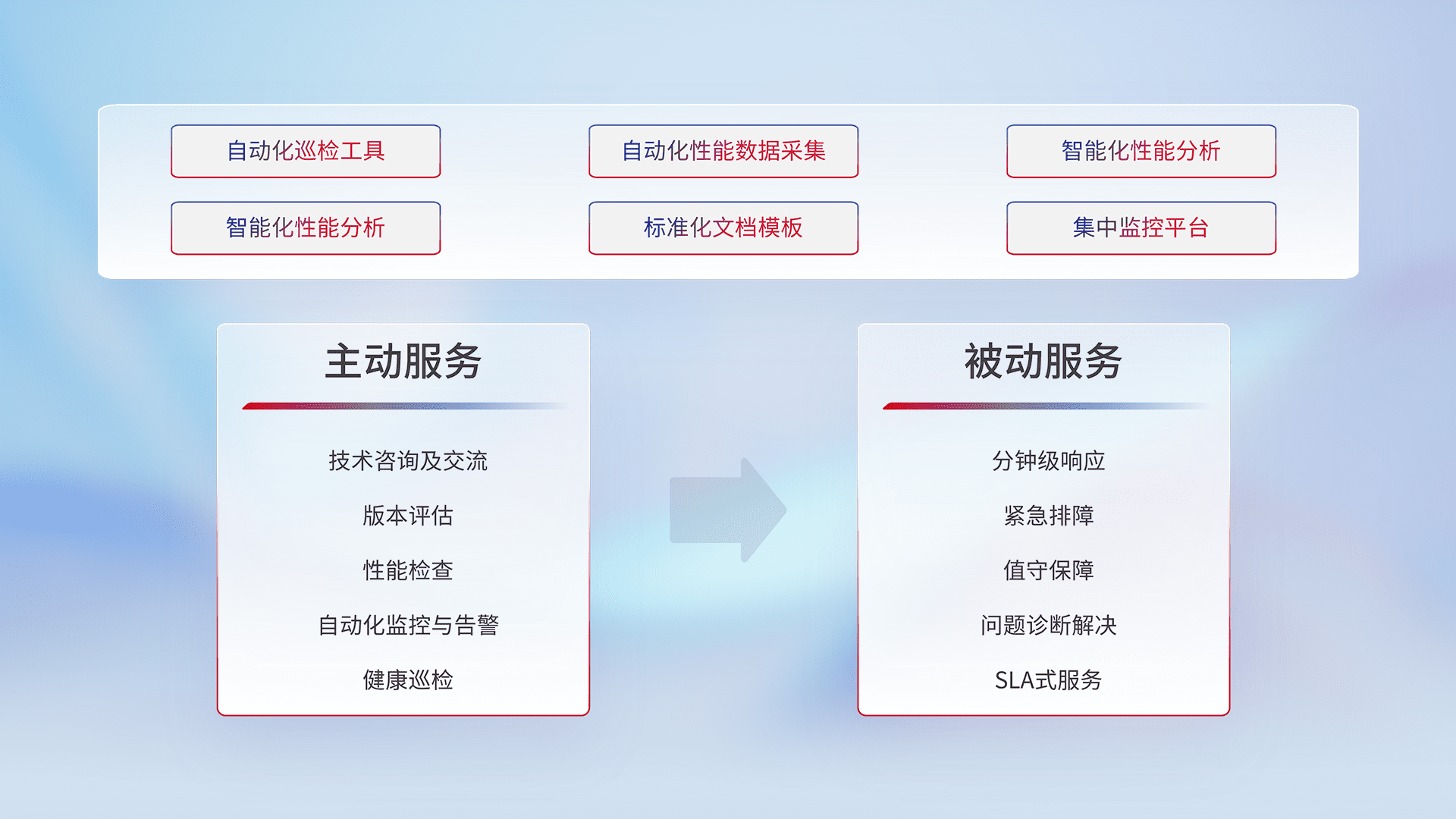 智能化工具和标准化文档,,,,保障服务质量,,提供主动服务(包含技术咨询、、版本评估、、、性能检查、、自动化监控与告警、、、健康巡检)和被动服务包含(分钟级响应、、紧急排障、、、、值守保障、、、问题诊断解决、、SLA服务)。。。