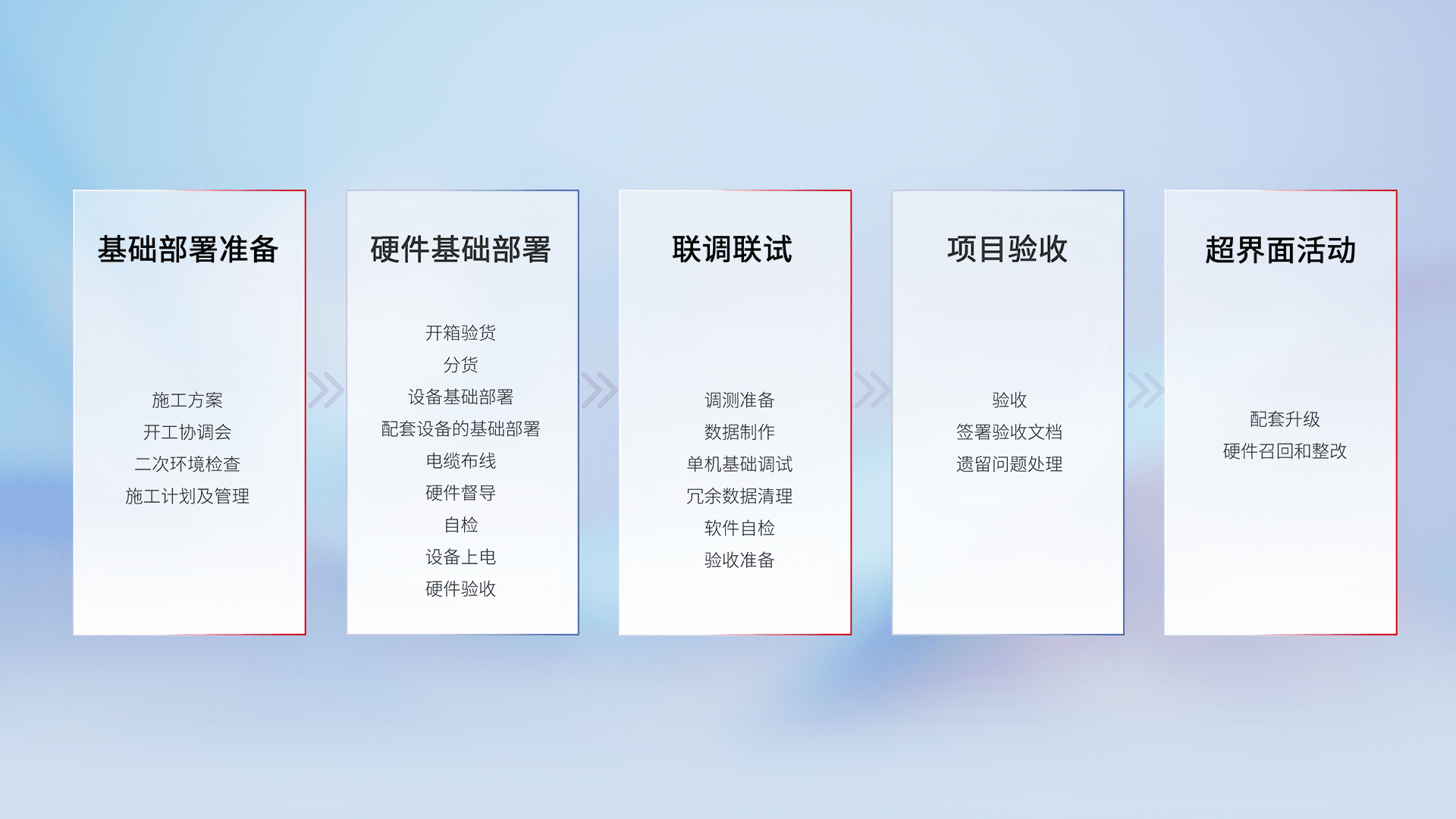 从基础部署准备、、、硬件基础部署、、、联调联试、、项目验收、、、越界面活动的全过程可追溯,,保证施工质量和进度。。